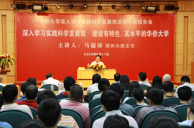 在报告中,马儒沛副主任结合科学发展观的第一要义、核心、基本要求、根本方法和精神实质,理论联系实际,就我校开展深入学习实践活动提出了三点意见:一要紧紧扣住把学习贯穿始终这个要求,不断增强贯彻落实科学发展观的自觉性和坚定性;二要紧紧围绕为侨服务这个宗旨,加强对侨务工作形势的认识;三要紧紧抓住突出实践这个关键,加倍努力,把华侨大学办成有特色、高水平的综合性大学。