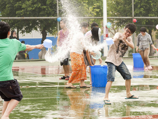 泼水场面更是热闹非凡。同学们拿着水瓢、水盆、水枪等容器盛水相互泼洒,表达祝福,并随着音乐跳起欢快的舞蹈。
