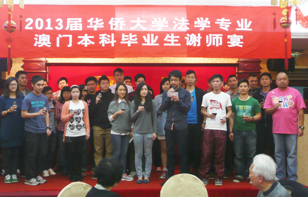 当晚,澳门学生在泉州酒店举办谢师宴。校党委副书记朱琦环,老领导庄善裕,澳门镜海学园校长刘月莲,校友工作办公室、统战部、法学院、继续教育学院、泛华学院负责人及部分任课教师应邀出席。