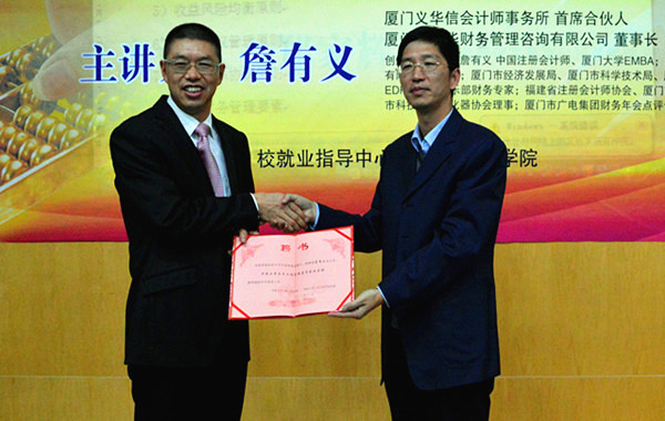 厦门义华信会计师事务所首席合伙人詹有义通过真实的创业案例,为学员们讲解会计及财务管理的内涵和外延,现场绘制资产负债表与在场学生进行互动。他在阐释财务管理的七项原则和六要素时,强调财务管理与生活的紧密联系性,并认为财务状况是一个企业的晴雨表。他告之同学们在创业过程中要重视对财务的科学运作。詹有义对创业班的模式表示赞赏,他认为创业班是一种让学生了解创业、接触创业非常好的方式。