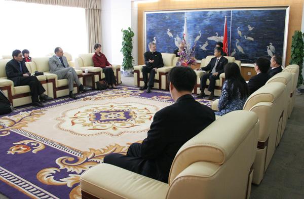19日上午,美国德保罗大学校长富兰克林•霍尔茨施耐德博士一行莅校访问,洽谈与我校开展学术交流与合作事宜。德保罗大学中国项目拓展负责人帕特里克•莫菲博士、副校长杰•布拉茨女士、副校长助理约翰马里奥•贝萨纳博士,该校中国区联系人、国际教育专家赵燕澍博士等同行。
