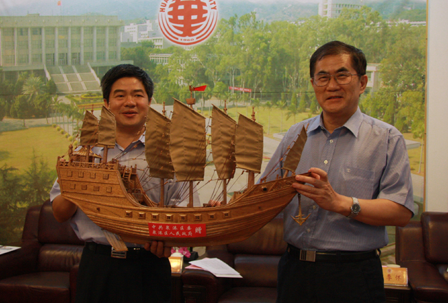 游祖勇代表泉港区向华侨大学赠送纪念品。