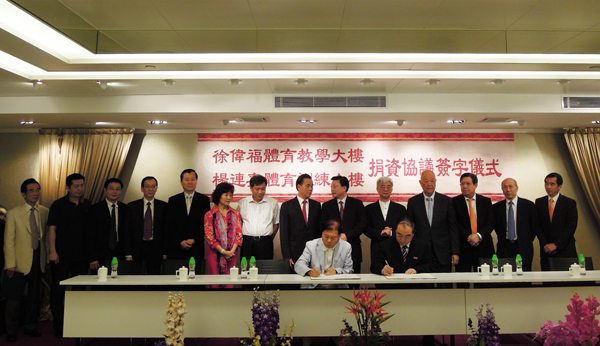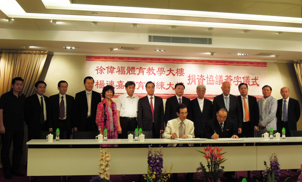 6月13日下午,校长贾益民与香港南益实业(集团)有限公司董事、华侨大学第六届董事会董事徐伟福先生、杨连嘉先生分别签订捐赠协议书,校董徐伟福捐资500万港币用于建设华侨大学“体育教学大楼”,校董杨连嘉捐资500万港币用于建设华侨大学“体育训练大楼”。该两座大楼将建于泉州校区西区新征地,进一步完善泉州校区体育设施。