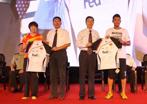 林丹、汪鑫代表四名伦敦奥运健儿向学校赠送签名纪念球衣