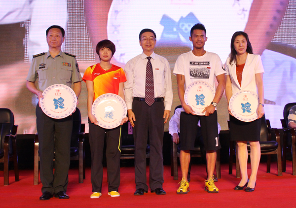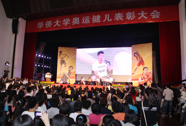 在举世瞩目的2012年伦敦奥运会羽毛球比赛中,我校林丹、李雪芮、谌龙、汪鑫等四名同学代表国家参赛,取得了两金一铜的卓越成绩,为祖国赢得了荣誉,为学校增添了光彩。为弘扬奥运精神,激励全校师生在各自岗位上为侨务工作和学校发展作出贡献,学校决定授予林丹、李雪芮“华侨大学卓越贡献奖”,授予谌龙、汪鑫“华侨大学重大贡献奖”。
