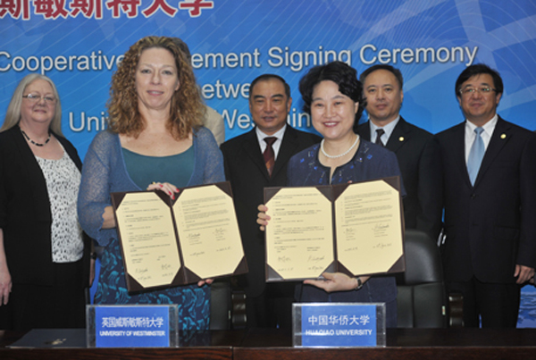 华侨大学与英国威斯敏斯特大学签署合作协议。华侨大学党委副书记朱琦环与英国威斯敏斯特大学副校长米兹卡·古斯考斯卡分别代表双方在协议书上签字。