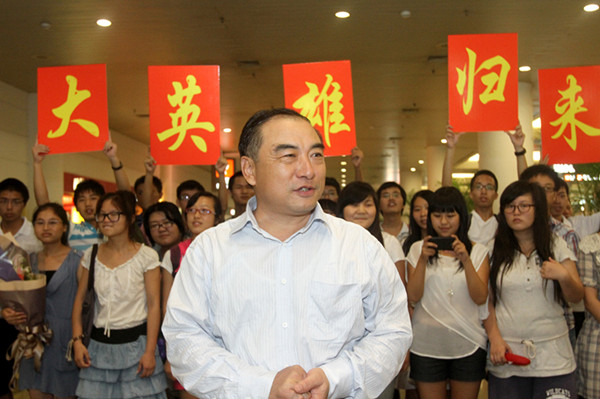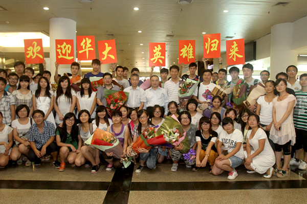 教练组和队员们在厦门机场一露面,就受到了师生们的热烈欢迎。“华大英雄,我们爱你!”欢迎英雄载誉归来的喊声不绝于耳,响彻大厅。