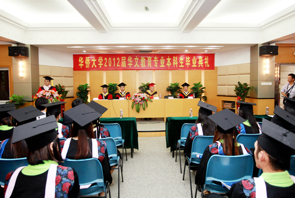20日下午,华侨大学华文学院2012届华文教育专业本科生毕业典礼在华文学院学术报告厅举行。国务院侨办副主任赵阳,国务院侨办文化司副司长李民,国务院侨办文化司院校处处长梁智卫,华侨大学副校长张禹东,华文学院院长孙汝建身着导师服,出席毕业典礼暨学士学位授予仪式,并为毕业生拨穗、颁发本科毕业证书和学士学位证书。孙汝建主持典礼。