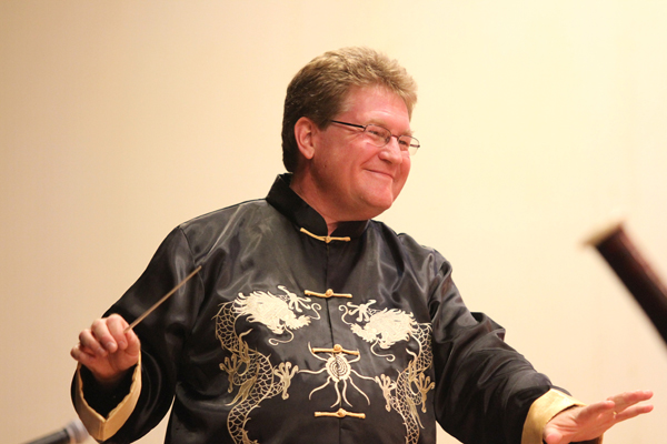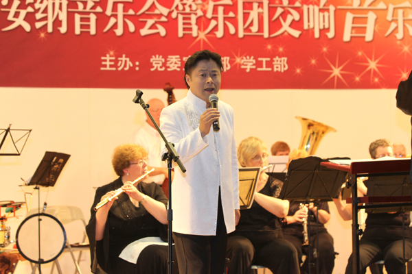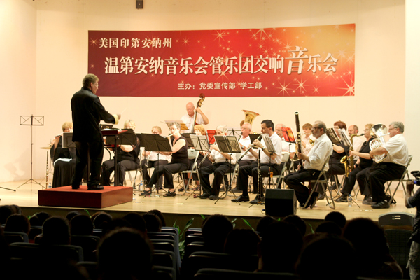 2012高雅艺术进校园之美国印第安纳州温第安纳音乐会管乐团交响音乐会昨晚在华大厦门校区王源兴国际会议中心G204举行。本次演出由印第安纳州瓦颇莱硕大学孔子学院院长孟剑云任领队,美国著名管乐指挥和教育家、乐团创始人瓦坡莱索大学(Valparaiso University)杰夫•斯考特•德博尔博士担任管乐团指挥。