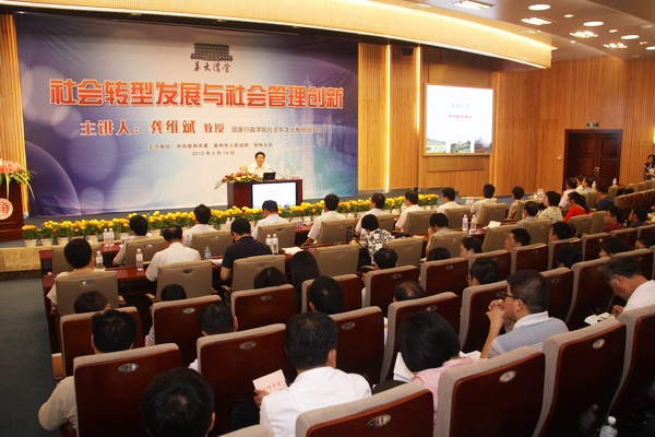 当日下午,由泉州市委、市政府和华侨大学共同主办的“华大讲堂”举行第29场报告会,邀请社会学博士龚维斌教授主讲社会转型发展与社会管理创新。据了解,龚维斌的主要研究领域为社会阶层、社会政策、社会管理,著有《社会发展与制度选择》、《公共危机管理》等多部著作,多次参与重要文稿起草,经常参与国家有关政策制定的咨询论证工作。