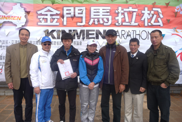 第五届金门马拉松赛26日上午在严寒的大风雨中开跑。来自海峡两岸的厦门大学、华侨大学,成功大学以及金门大学等高校学生代表参加两岸大学生路跑5人11.2公里公开赛角逐。最终,我校体育学院体育教育专业2011级学生曾嘉阳获得2012两岸大学生路跑赛个人组冠军。