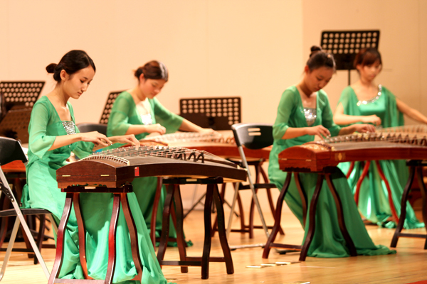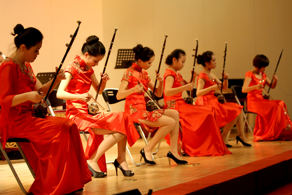 当晚,王源兴国际会议中心管弦齐鸣、丝竹流韵,一场由“华侨大学青年民族管弦乐团”担纲主演的民族音乐盛会,在民族管弦乐合奏《花好月圆》、《瑶族舞曲》、《春节序曲》所渲染的浓郁中国特色和节日喜庆气氛中开场。随后,弹与唱相协的“古筝重奏”《渔舟唱晚》,用音乐描绘了江南水乡渔舟晚归、江面歌声四起的动人画面;丝弦五重奏《映山红》、展现草原风情的二胡齐奏《奔驰在千里草原》、独具西北风情的笛子二重奏《跑旱船》等,赢得观众阵阵掌声。