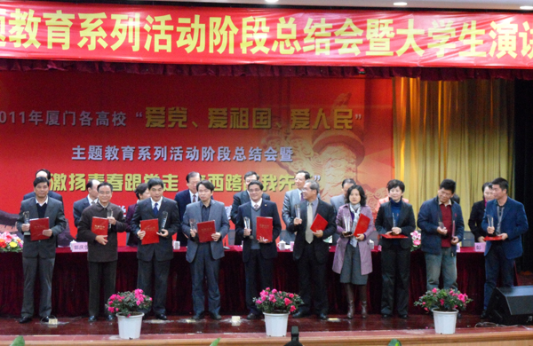 大会为在“三爱”主题教育系列活动主题征文比赛、思政课题调研中的获奖师生和高校颁奖,我校荣获2011年厦门市“三爱”活动优秀组织奖。在当天举行的厦门大学生“激扬青春跟党走,海西跨越我先行”主题演讲赛决赛中,我校信息学院2008级学生李爽以优异的表现,荣获二等奖。