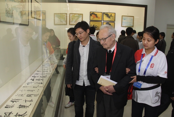 开幕式结束后,与会人员前往中国闽台缘博物馆参加“通会境界——饶宗颐教授二十一世纪书画新路向展”开展典礼。书画展展出了饶公21世纪以来的著作100余本及书画作品60件,全面展示了饶宗颐的艺术风格与学术水平。