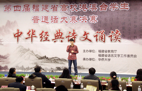 由福建省教育厅、福建省语言文字工作委员会主办,华侨大学承办的第四届福建省高校港澳台学生普通话大赛决赛12月9日在陈嘉庚纪念堂科学厅举行。