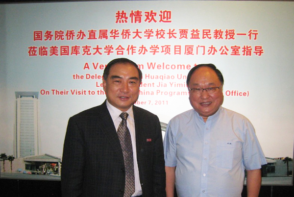 贾益民代表学校向黄天中校董多年来始终关心和支持学校发展,特别是为美国中文学院殚精竭虑,表示衷心的感谢。他表示,黄天中校董对华侨大学寄予厚望,关心和支持学校发展,特别是支持华文教育发展。贾益民指出,目前华侨大学面临许多机遇和挑战,学校董事的支持将进一步推动学校抓住机遇,实现跨越式发展;同时学校也将在现有基础上,加大改革力度,做好规划,推动学校又好又快发展,提升学校的综合办学实力。