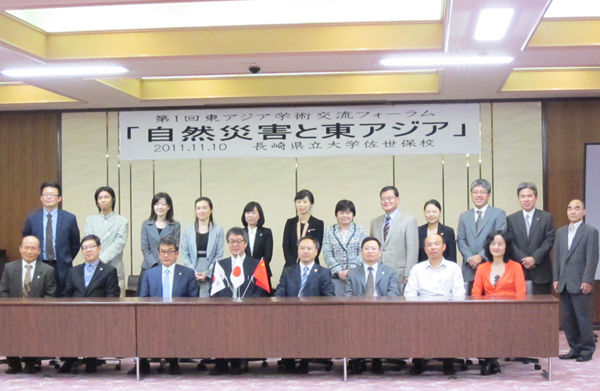 我校与长崎县立大学自1992年签订友好交流协议以来,双方轮流举办学术研讨会,已成功举办了19届。2010年,韩国东亚大学加入该学术合作项目。2011年1月,我校东方管理研究中心与日本长崎县立大学东亚研究所、韩国东亚大学东亚研究所三方共同签署了学术合作协议书。按照该协议,由三方合作举办“东亚论坛”,并由中日韩三国轮流主办。明年的“东亚论坛”将于10月中下旬在韩国釜山的东亚大学举行,2013年再轮由我校举办。