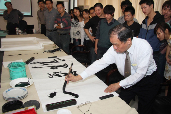 随后,张炳煌前往美术学院,就书法艺术的传承发表演讲,并参加笔会交流。他表示,练习书法需要找到正确的方法来提高效率,并且需要不间断的学习与自我提高。在如何发展书法艺术这一课题上,张炳煌指出,书法艺术的发展需要现代年轻人的传承,并希望借助年轻人的力量,使文字的生命力得以延续。