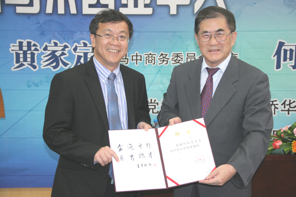 黄家定说,非常高兴有机会来华侨大学,成为华大客座教授,“以后我们和华侨大学的关系就这样定了下来,就不能说来一次以后就不来了。”何国忠表示,今天走进华侨大学终于了却了一个心愿,他认为“侨”这个字带有重要的文化信息,让所有华人有寻根的感觉,而华侨大学在传承中华文化的伟大事业上,在帮助广大海外华人实现寻根的心愿上,做出了自己的贡献,值得所有海外华人敬仰。