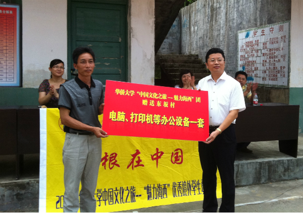 当天在大田县桃源镇东坂村还举行了“华侨大学境外生文化实践教育基地”揭牌仪式。基地将为推动境外学生了解祖国,寻根文化提供宝贵平台。同时我校还并向东坂村赠送了电脑以及打印机等设备。