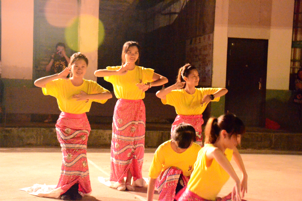营员在与当地村民合办的篝火联欢晚会上表演东南亚节目