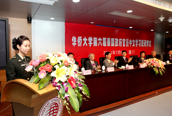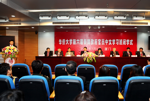 在厦门校区行政研发大楼401室,泰国华文教师公会主席罗宗正、华大党委书记李冀闽、国务院侨务办公室文化司副巡视员汤翠英,先后致辞祝贺第六届泰国政府官员中文学习班成员圆满完成学业。泰中文化经济协会副会长张祥盛、肖汉铭,副秘书长蔡百河,泰王国驻厦门总领事馆副总领事刘盛国,华大副校长张禹东,及校办、宣传部、外事处、华文学院负责人等出席仪式。华大华文教育办公室主任赵明光主持仪式。