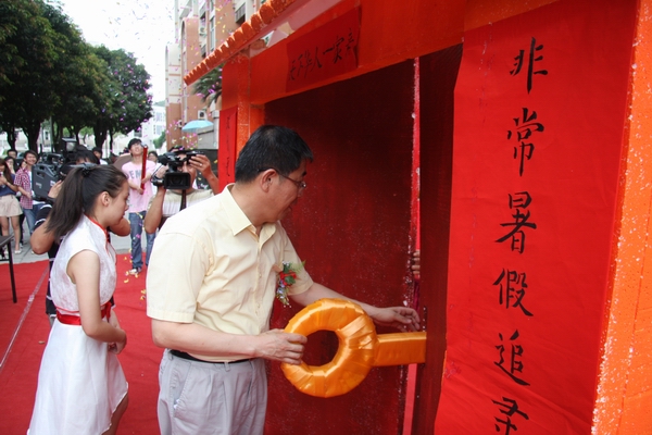 在精彩的舞狮等一系列表演后,关一凡副校长用金钥匙开启了象征中国家庭的道具门,宣告本次活动正式启动。副校长关一凡、校长助理曾路、学生处处长陈国柱、校团委书记李庭志并分别向四支家庭队伍授旗,预祝他们出征圆满成功。
