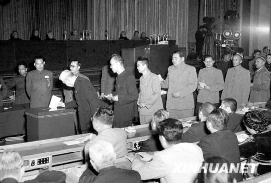 9月20日,出席大会的代表经投票表决,全票通过了《中华人民共和国宪法》。宪法明确规定,新中国的国体是工人阶级领导的、以工农联盟为基础的人民民主国家,政体是实行民主集中制的人民代表大会制度。人民代表大会制度作为我国的根本政治制度正式确立。