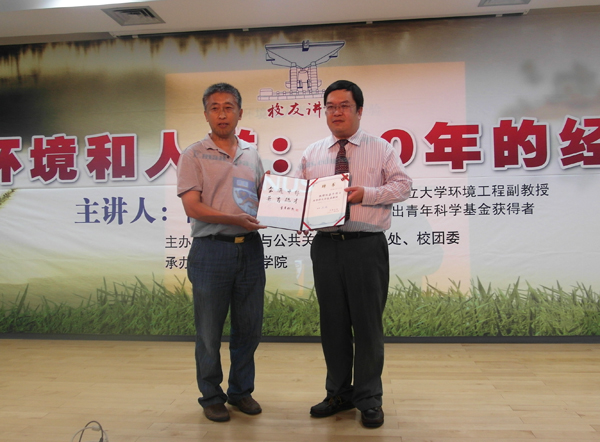 6月21日下午,我校化工专业88届校友、中国国家杰出青年科学基金获得者、新加坡国立大学环境工程系副教授陈嘉平博士应邀作客华侨大学“校友讲坛”,在厦门校区王源兴国际会议中心G-101作了题为“环境和人类:20年的经验”的学术讲座。