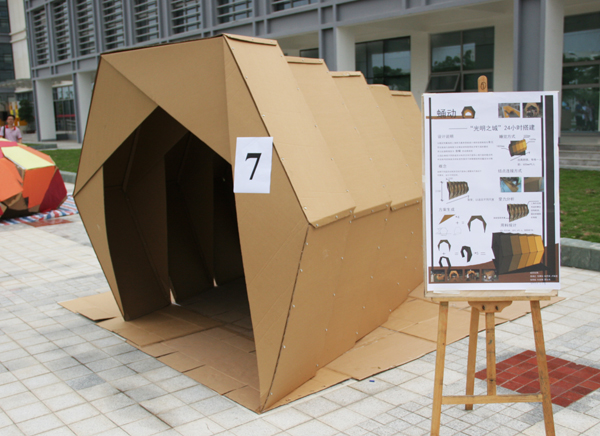 作品“魔方”所在的团队来自大一,共有四人,他们展示了房子的“变形能力”:女生睡觉的这边,天花板盖紧,空间十分私密,而男生休息的这边则可打开天窗,通风和透光性能良好。“9平米的房子,使用蜂窝板和废弃纸板,成本不到400元”,易长文给记者算了笔账说:“尽管没有获奖,但作为唯一的新生团队,大胆的设计和多变的造型还是获得了一致好评”。