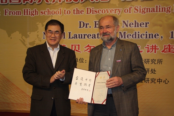 Erwin Neher 教授还欣然受聘我校荣誉教授。讲座之前,丘进校长为 Neher 教授颁发了华侨大学荣誉教授证书,并为他佩戴校徽。