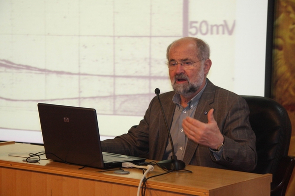 Erwin Neher 教授从西班牙生理学家、1905 年诺贝尔奖得主 Ramon y Cajal 发现神经元、创立现代神经生物学开始娓娓道来,逐步深入地介绍了当前神经科学的前沿问题。他将人类大脑跟计算机进行对比,指出两者之间的最主要区别:人脑是有可塑性的,能够根据经历而发生适应性变化;人脑中的信息处理是高度并行的。揭示大脑智能的奥秘是无数科学家梦寐以求的目标。神经生物学界有两种主要的研究思路:自上而下( Top-Down )与自底而上( Bottom-Up )。Erwin Neher 教授重点介绍了自底而上的研究思路,并融入了自己的研究经历。报告中 Neher 教授通过丰富的图片和详尽的文字说明,让人对这种人体内微观的生理进程产生了浓厚的兴趣。