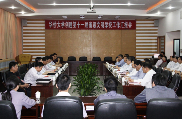 5月25日上午,华侨大学创建第十一届省级文明学校工作汇报会在陈嘉庚纪念堂二层会议室举行。第十一届省级文明学校考评组成员,校领导丘进、李冀闽、关一凡、朱琦环、徐西鹏、刘塨、张禹东、刘斌,校文明学校评建办及相关部门负责人参加汇报会。