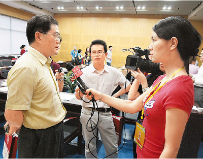 5月12日,美国中文电视记者采访华侨大学校长丘进(左)。