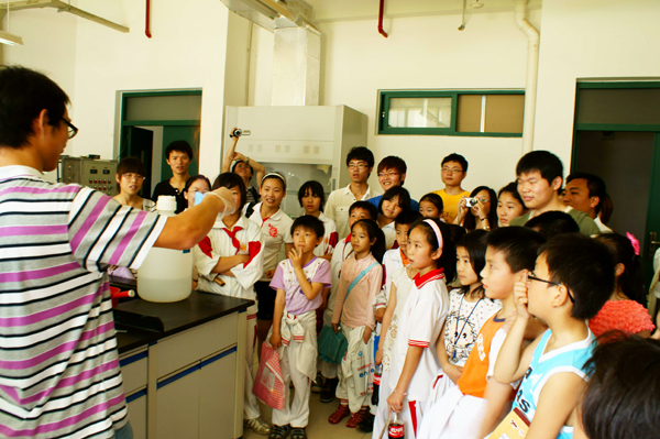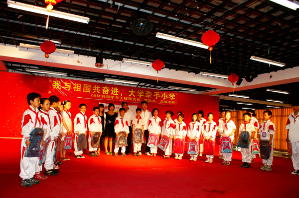 08级材料班同学带领世平学校师生一行28人参观了四端文物馆、教学楼、实验楼、图书馆以及公共生活区等教学生活设施,并在食堂小广场为小学生们宣传党情、党史知识。活动中,08级材料同学还献上了自编自导自演的话剧《魂之安曲》,穿插唱红歌、党史知识问答等,以大学生特有的创意讴歌党的光辉历程。活动最后,08级材料班同学还向小学生们赠送了学习用品,并一起观看了爱国电影《东京审判》。
