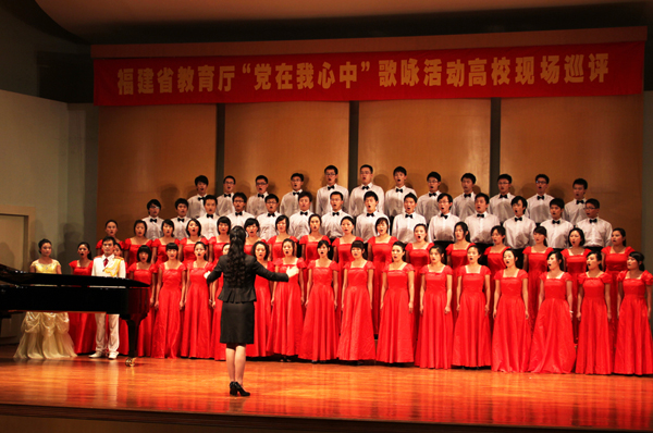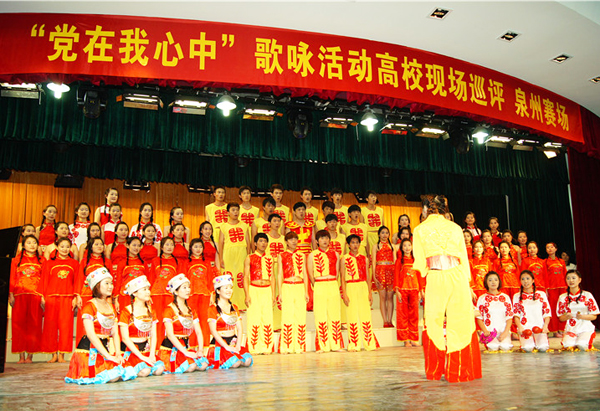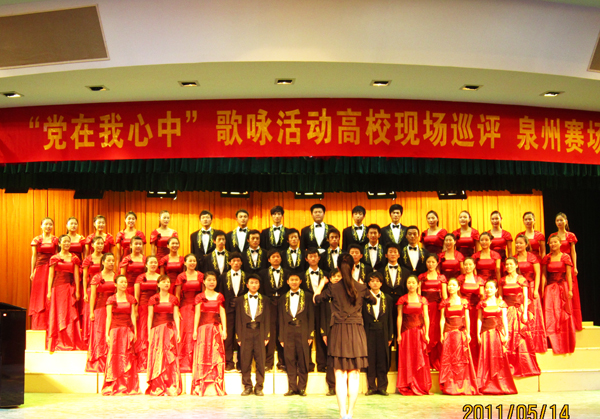为纪念中国共产党成立90周年,抒发全省广大青少年学生热爱党、热爱祖国、热爱社会主义、热爱家乡的豪情壮志,福建省教育系统“党在我心中”歌咏活动高校现场巡评近日在泉厦两市举行,我校旅游学院、文学院和化工学院代表队分别参加了泉州赛区和厦门赛区的比赛。