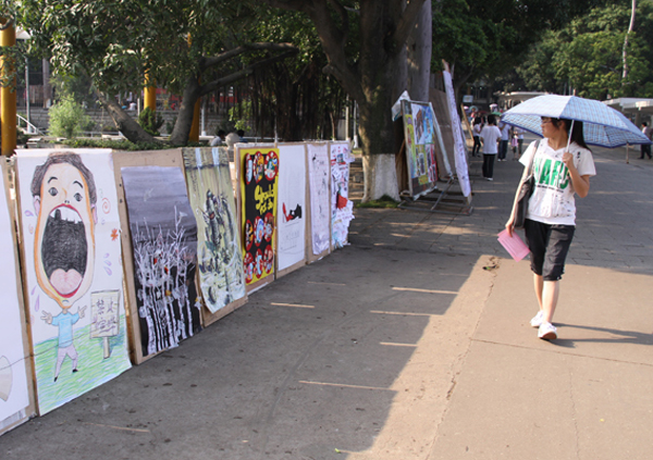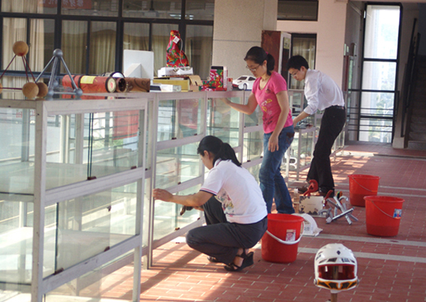 学院教师清理学生作品展示橱窗