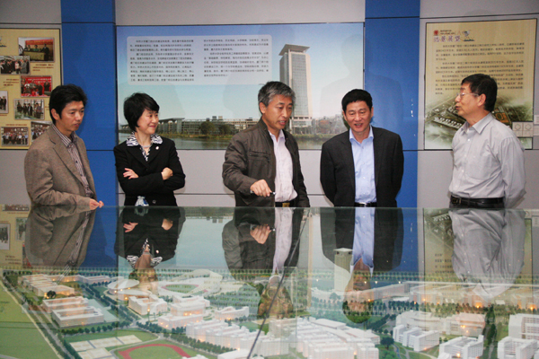 在位于主楼1楼的厦门校区规划模型室,李冀闽书记向客人详细介绍了校区建设立足于“集约用地、以人为本、资源共享、绿色环保及生态与景观融合”的五大建设理念;刘塨副校长简介了校区的建设规划、建筑布局、发展规模与学科分布等情况。