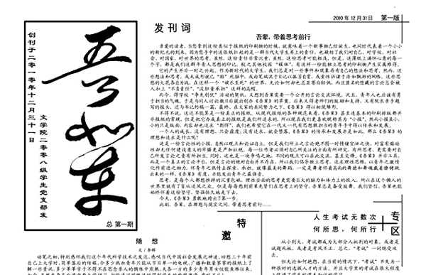 创先争优活动开展以来,支部召开全体党员大会,就活动精神和主题开展了热烈讨论。在党员集体的努力下,支部党员还结合自身所学广播电视新闻专业,于2010年年底创办了支部小报《吾辈》。《吾辈》追求“吾辈,带着思考前行”的目标,以党员研究时事及评论为主,号召党员创先争优,发出自己的声音,争做与时俱进的“新青年”。《吾辈》至今已出版2期,支部也在学习交流中展现出了自觉、民主、和谐、向上的氛围。