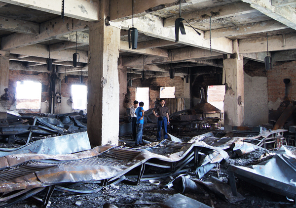 郭子雄教授(右)深入受灾现场评估建筑安全状况