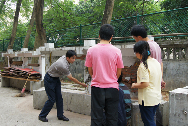 郭子雄教授(左)讲解震害现象