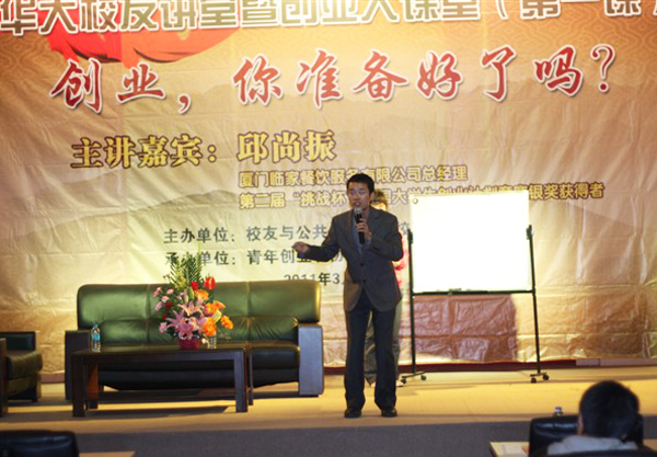3月25日,由校友与公共关系处、校团委和学生处主办,青年创业者协会承办的华大校友讲堂暨创业大课堂第一课在明德堂举行。工商管理系2001届校友、厦门临家餐饮服务有限公司总经理邱尚振在题为“创业,你准备好了吗?”的演讲中,与学弟妹分享了自己的创业经验。