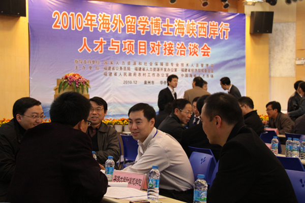由福建省公务员局、福建省人力资源开发办公室、福建省经济贸易委员会、福建省政府农村工作办公室、中国海峡人才市场共同主办的“2010年海外留学博士海峡西岸行”今日到站华侨大学泉州校区,与华侨大学等在泉高校、科研、企业单位进行人才和项目对接洽谈。
