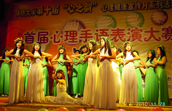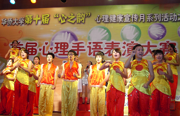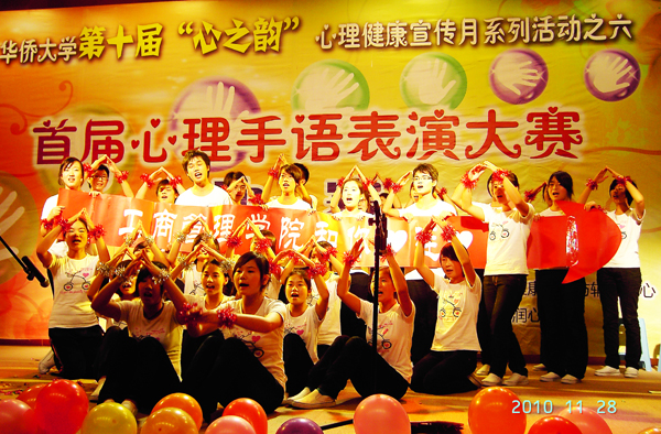 十年兼程,心灵焠砺。在“心之韵”心理健康教育宣传月迎来十周年之际,我校大学生心理健康教育与心理保健工作在群众性、组织性和特色化方面取得了丰硕成果。新组建的各学院、港澳台、境外留学生的心理保健部也首次在大赛组织工作中亮相,保证了心理手语活动成为本届宣传月的新亮点,显示出我校大学生心理健康自主教育已进入制度建设、规范管理的良性轨道。
