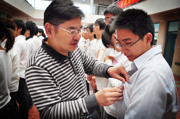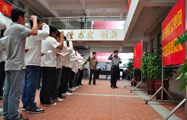 仪式上,张云波院长为学生党员一一佩戴了党徽,并勉励全体学生党员以优秀共产党员的标准要求自己,深入学习实践科学发展观,争做成才表率,争当“优秀学生标兵”。 最后,张云波院长带领全体出席党员重温了入党誓词。
