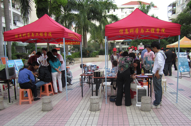 由信息学院团委科技部和青年志愿者部组织的“小家电义务维修进社区”活动14日在集美区中心花园举行。据不完全统计,在长达近9个小时的服务过程中,共接待社区居民一百五十余人,为他们提供了义务维修和家电保养常识等相关服务;收到包括电风扇、消毒柜、电吹风、收音机、豆浆机、手机、电加湿器、热水壶、电磁炉等58件待修小家电,修复好33件;提供修复和保养咨询的121件,所接收到的小家电修复后均安全归还,受到共青团集美区团委、集美区中心花园校区物业管理部以及小区居民的一致好评。