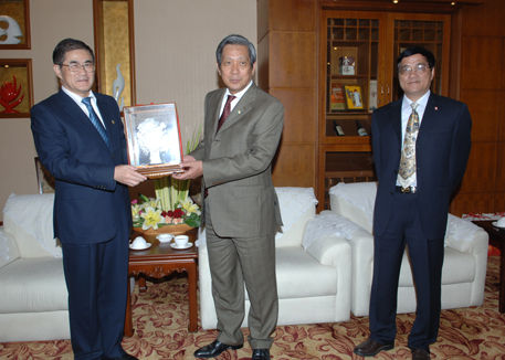 11月4日,丘进校长在厦门悦华酒店会议室会见率领泰中文化经济协会代表团来访的泰国前副总理披尼先生,副校长张禹东会见时在座。 披尼先生分别赠送华大和华文学院艳丽的蝴蝶兰,以贺华大 50 华诞和对我校为泰国政府官员长期开展中文培训所做贡献的诚挚谢意。