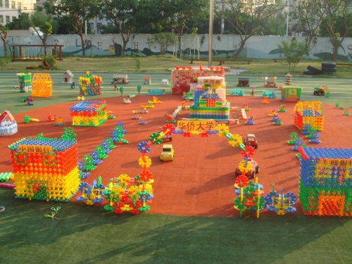 活动中,全园师生同心协力完成华园主要建筑模型建构。其中:大中班孩子们运用已学过的拼插技能,用灵巧的小手自主创新,展现的是独特新奇的教学楼房,绚丽多彩的华园主要建筑物。小班的孩子们与爸爸妈妈一起,用稚气的小手,展示出一座座美丽的城堡和尤梅幼儿园温馨大家庭。