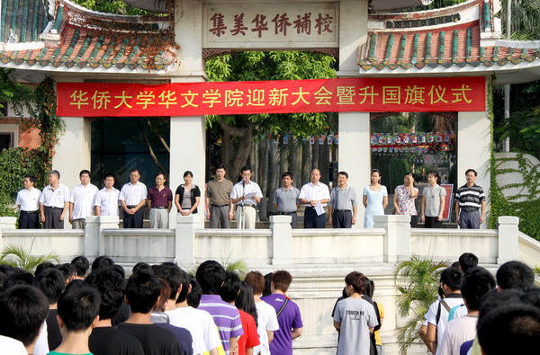 9月14日清晨,华文学院在南门广场举行隆重而庄严的2010级新生开学典礼暨升旗仪式。全体院领导、中层干部和2010级境内新生参加了开学典礼,仪式由张灯副书记主持。