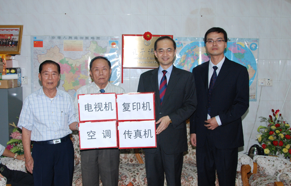 叶大波大使(右二)代表中国驻缅甸使领馆赠送给福星孔子课堂一批办公设备。